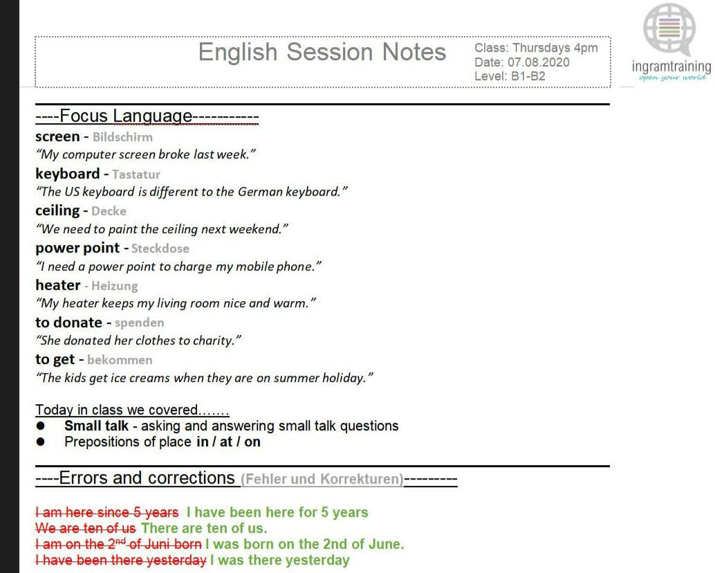 To allow you to focus on speaking, session notes including key new vocabulary, phrases, pronunciation, errors/corrections, the session material/resources and homework tasks are prepared and sent to every client at the end of every session.☝ Do you offer courses or support to language trainers?